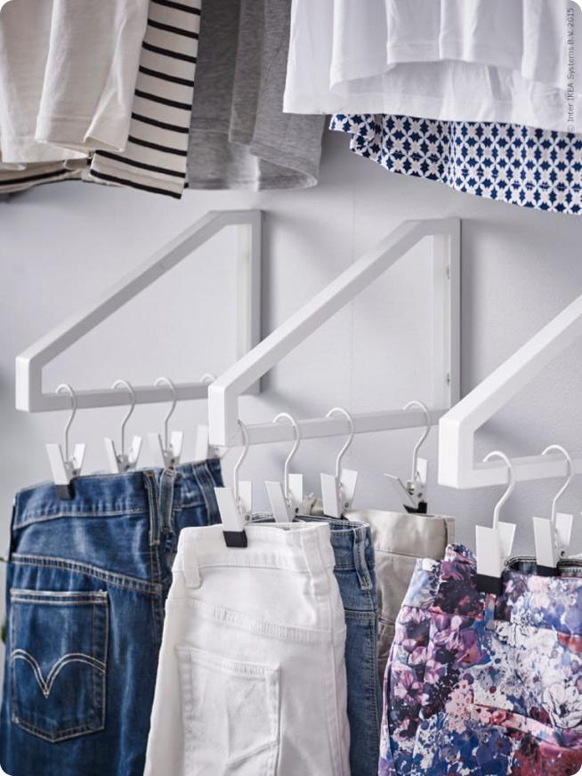 Оказалось, что несколько перевернутых кронштейнов, повешенных на голую стену, позволят быстро создать место для вертикального хранения одежды.