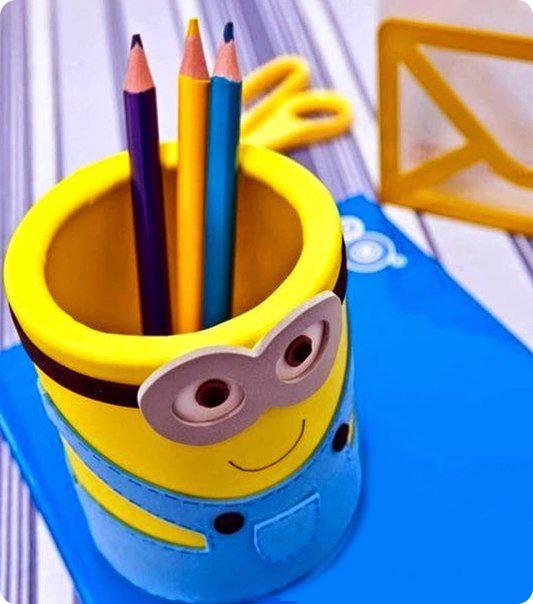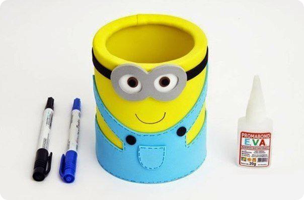 Не так давно прошла премьера нового мультфильма "Миньоны". Потому, думаю, не один малыш не устоит от соблазна, чтобы сделать такую забавную карандашницу в виде героя мультика)