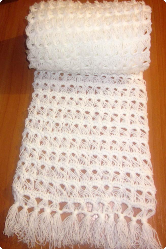 Набрала крючком 65 петель (13 по 5). Затем на линейку одела все петли. Вытащила линейку. На пяти колечках делаю пять столбиков с накидом. И так до конца.
